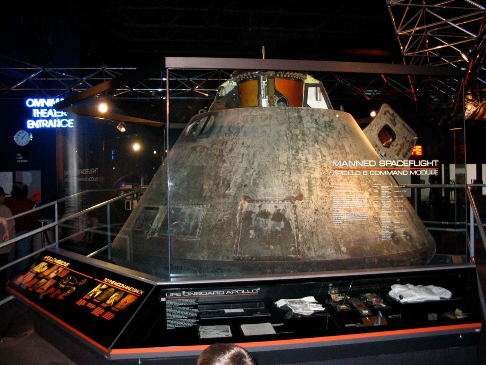 Located in the Henry Crown Space Center, the Apollo 8 Command Module is displayed within a modern Plexiglas display case. A raised walkway allows visitors access to see the interior of the capsule.