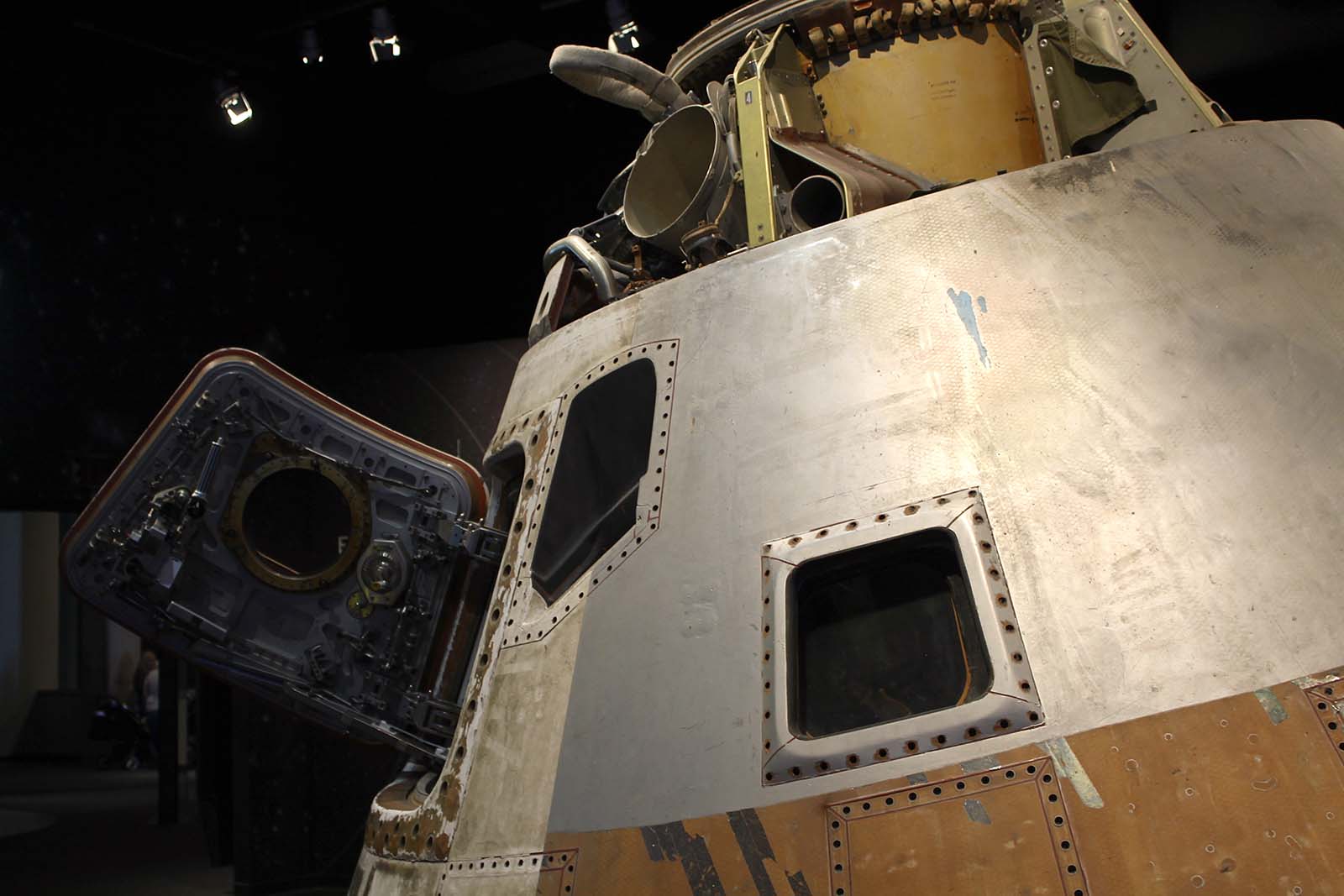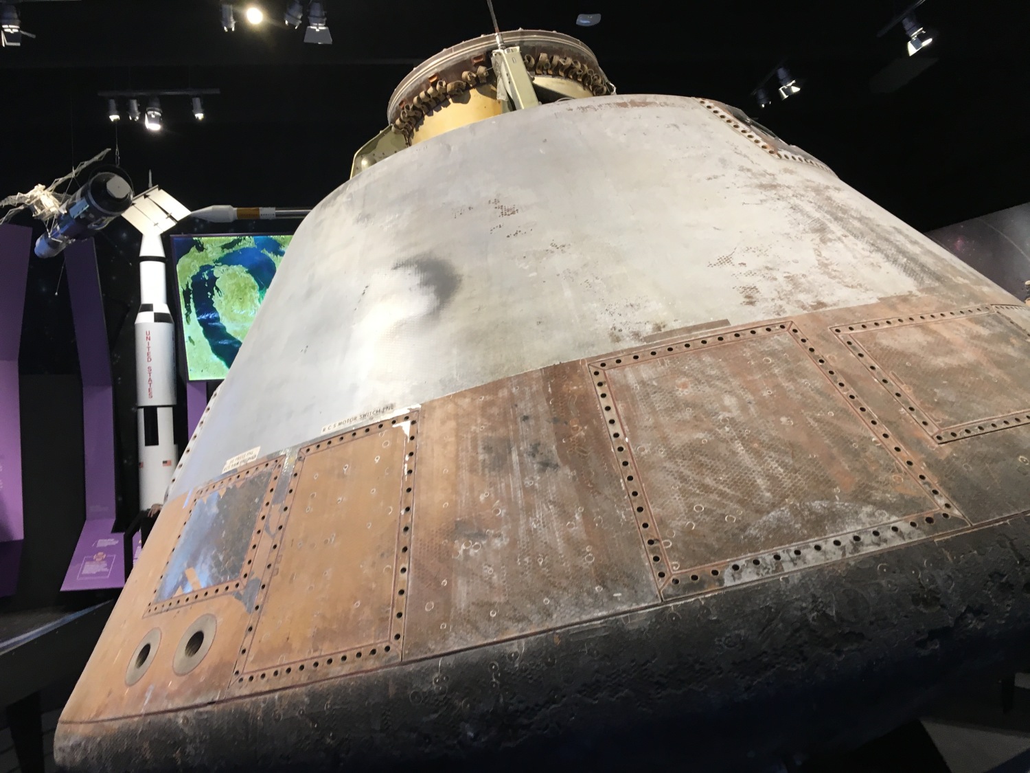 This command module is displayed at the Great Lakes Science Center in Cleveland, Ohio. None of capsule is encased in Plexiglas. Notice, as with other Skylab spacecraft, it is painted on one side to control thermal stability while parked at the Skylab station.
