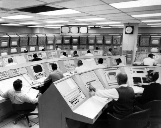 Three different groups of sensors obtained data concerning the Apollo spacecraft: ground service equipment, carry-on equipment that was removed prior to flight, and sensors built into the spacecraft. Coaxial cable and radio connected the various sensors to the control rooms in the operations and checkout building. There, data traveled through one of three different paths. The most important, from the standpoint of real-time display, was the display computer. Its functions included: comparing machine words to determine whether data fell within predetermined limits, converting data into engineering units (such as heat rise in degrees per second), and generating signals that would produce alphanumeric displays on consoles. The display system was impressive but not foolproof. An engineer recalls that on its first day of operation, the console welcomed them: “GOOD MORING.” ACE had failed its first spelling test.40