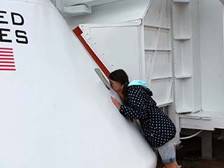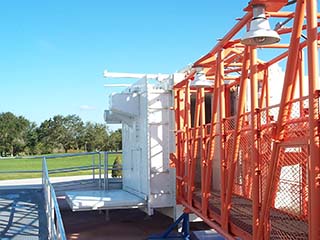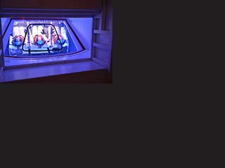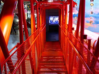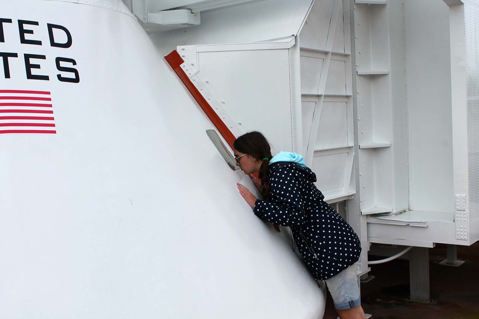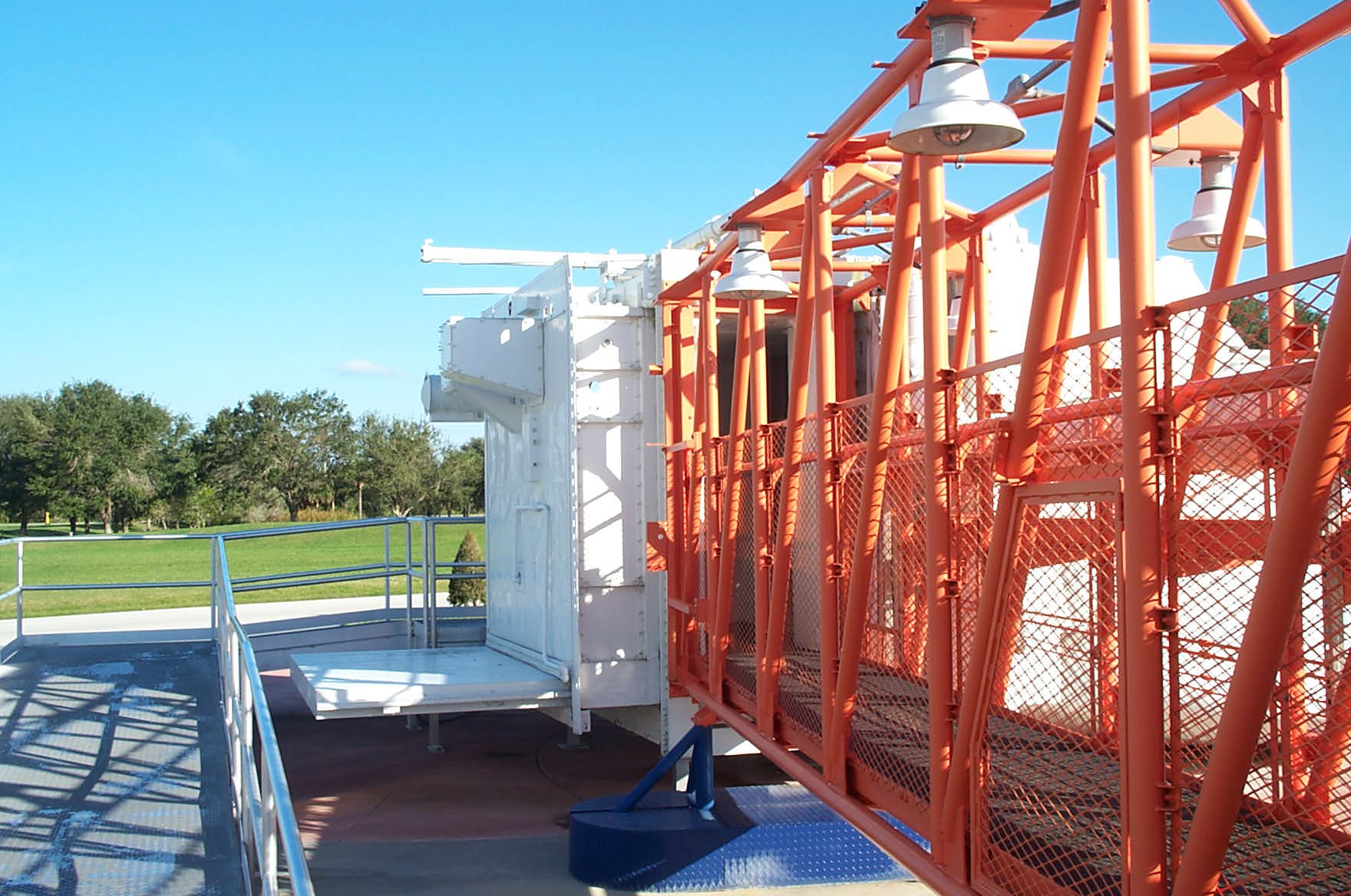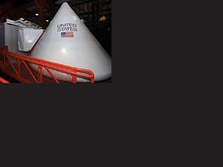 After walking down a portion of the actual arm from the Launch Umbilical Tower used for Apollo 11, you enter one of the two Apollo White Rooms to look inside an Apollo training capsule. The white room was formerly outside in the Rocket Garden, but it is now integrated into the Ad Astra Per Aspera - A Rough Road Leads to the Stars exhibit. It is not clear if this white room was used on LC 39A or LC 39B.